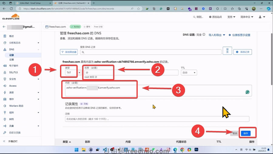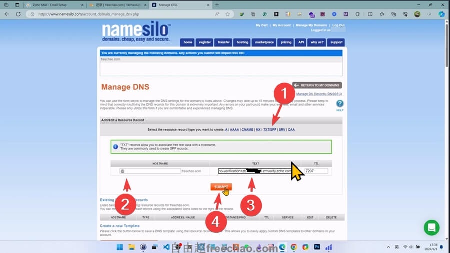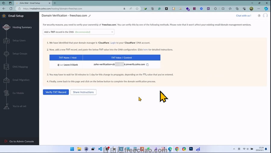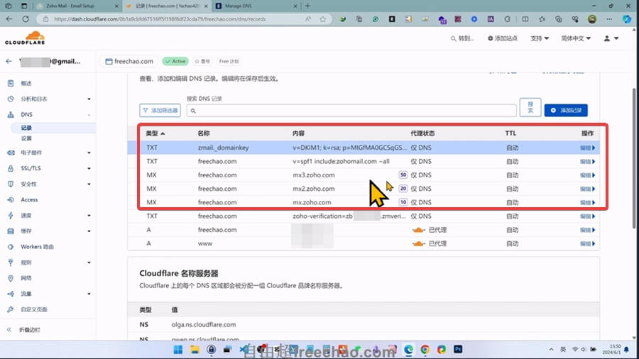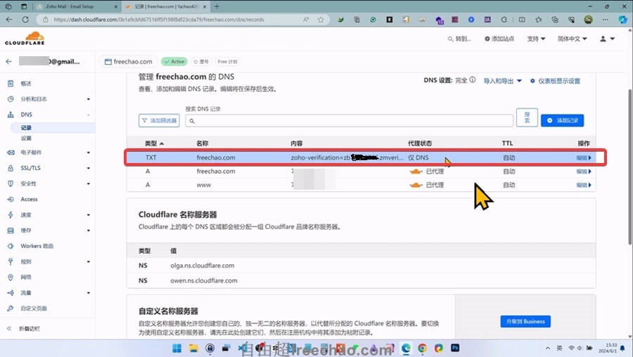 zoho会自动检测到我们的域名目前是在DNS解析在哪里的,在哪里就去哪里添加这条记录。比如cloudflare、阿里、namesilo、siteground等等