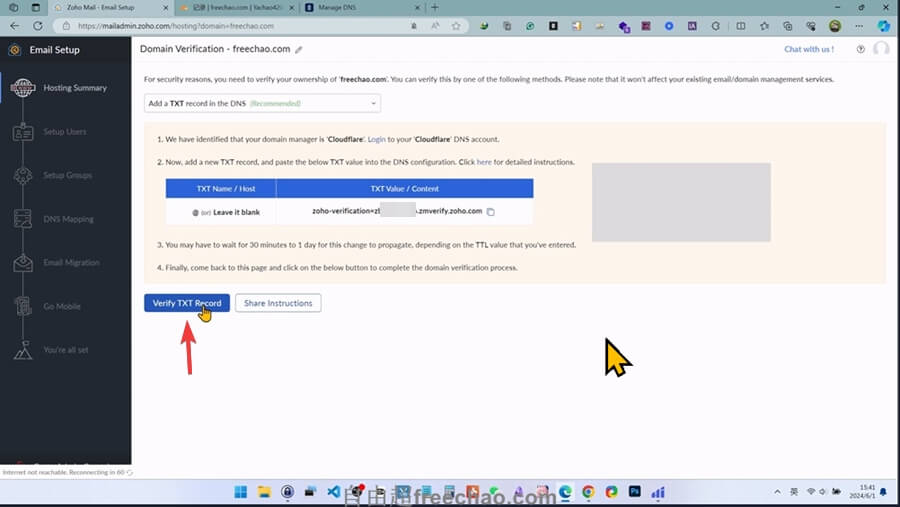 添加完DNS解析,就可以点击【Verify TXT Record】