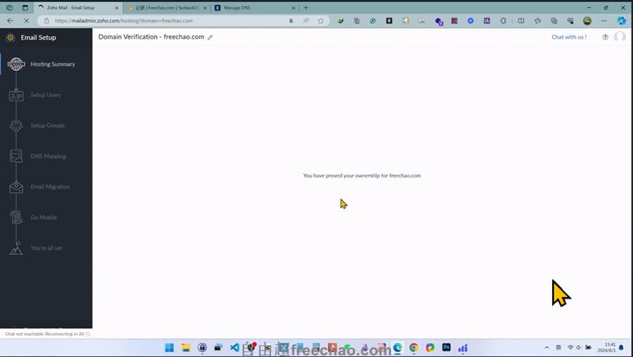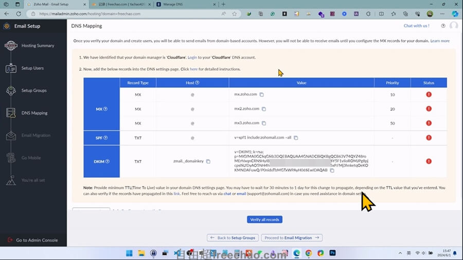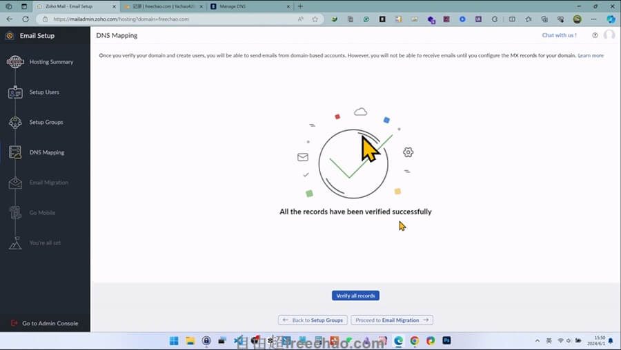 zoho系统会自动扫描DNS解析,解析成功并且信息一致的话,就可以完成域名归属验证。