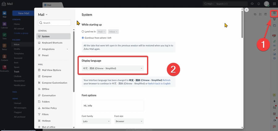 默认邮箱后台是英文界面,进入邮箱简单一些初始化设置后,我们可以点击右侧的小齿轮,在Display language里面选择中文,然后刷新下网页就把后台变为中文了。