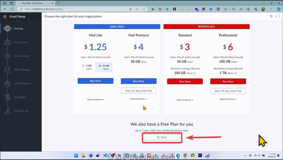 不管这些,我们拉到浏览器最下方,会看到【We also have a Free Plan for you】,点击【Try Now】使用免费版。