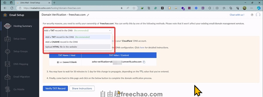 在跳出的验证页面,zoho提供了3种方式:TXT DNS解析、CNAME DNS解析、HTML文件