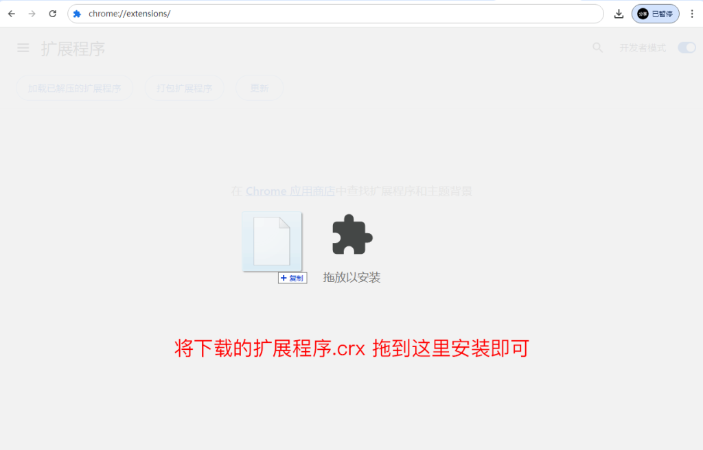 打开浏览器 管理扩展程序,开启《开发者模式》,再将下载的扩展程序.crx 拖到浏览器窗口安装。